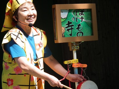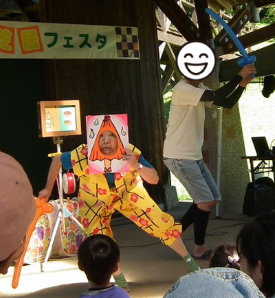 続いて「からかさおばけ」になって、会場のお父さんとバルーンバトル!